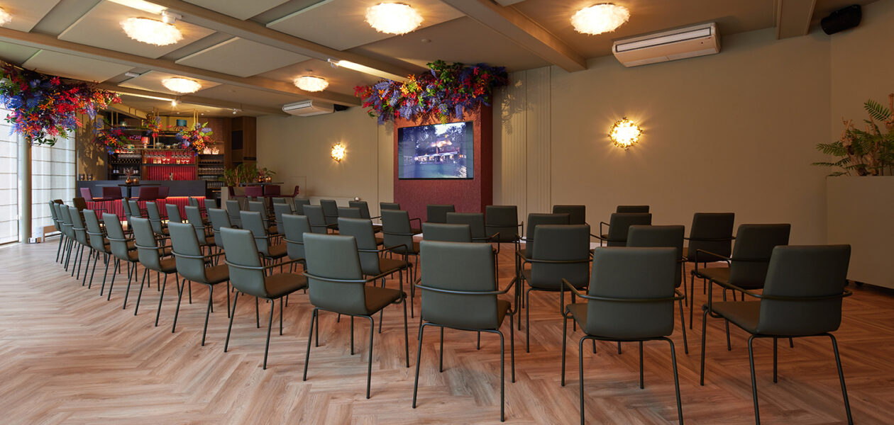 De Tuinkamer is de grootste ruimte van Auberge du Bonheur en is totaal gerestyled. De royale ruimte heeft een strakke, maar kleurrijke uitstraling en is van alle faciliteiten voorzien. Van een 85 inch presentatiescherm, akoestische wandpanelen tot de meest moderne audiovisuele technieken: aan alles is gedacht om de bijeenkomst onvergetelijk te maken. Door de eigen toiletruimte is het de perfecte locatie om de hele dag in alle rust te vergaderen. Met openslaande deuren stap je zo het privéterras op om een frisse neus te halen en heb je prachtig uitzicht over de tuin van Auberge du Bonheur.
